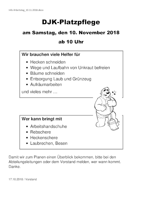 2018-10-28 DJK Platzpflege am 10. November ab 10 Uhr Am 10. November werden Helfer für die Platzpflege auf dem DJK gesucht. Alle weiteren Infos entnehmen Sie bitte dem Bild.