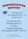 2018-12-09 Der DJK Feudenheim sucht Verstärkung! Für unsere Frauengymnastikgruppe am Dienstag Abend (20:00 - 21:00 Uhr) suchen wir ab sofort eine/einen Übungsleiter/-in. Bei Interesse melden Sie sich einfach bei der E-Mail Adresse erwachsenenkurse@djk-feudenheim.de